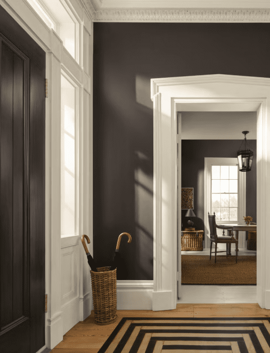 Divine Damson serves effectively as a standalone statement color, enhancing the depth and sophistication of home offices, bars, and transitional areas such as hallways.